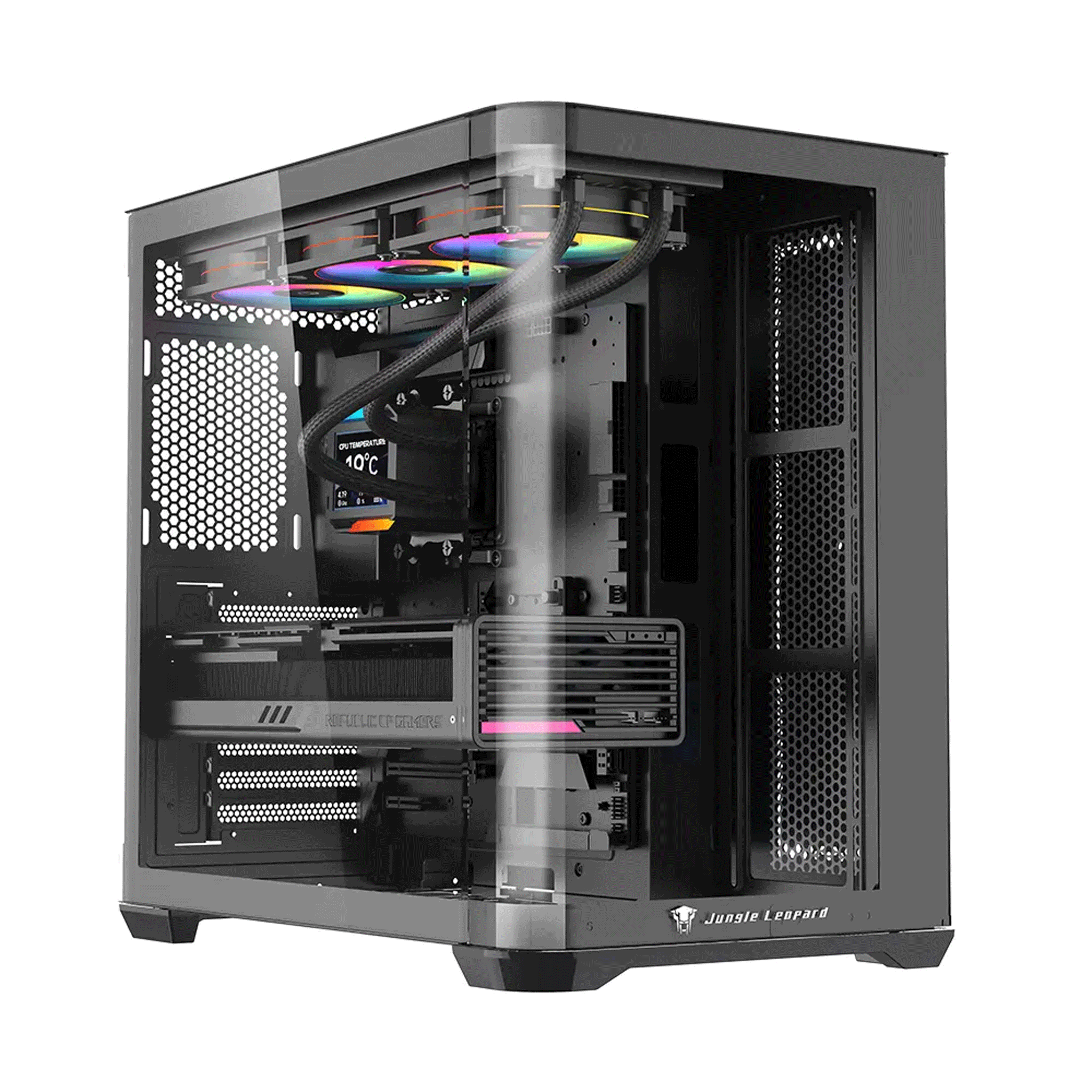 Ấn tượng đầu tiên về Leopard AC-01 chính là thiết kế “hồ cá” với mặt kính cong quyến rũ, mang đến một vẻ ngoài hiện đại và tinh tế. Chiếc case này không chỉ là nơi chứa đựng “trái tim” của bộ PC mà còn là một tác phẩm nghệ thuật, giúp bạn khoe trọn vẻ đẹp của các linh kiện bên trong, đặc biệt là hệ thống đèn RGB lung linh.