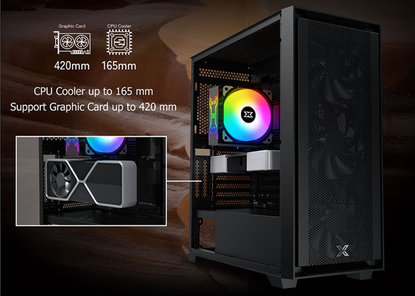 Xigmatek ANUBIS PRO 4FX E ATX hỗ trợ độ cao cho tản nhiệt khí CPU là 165 mm, độ cao dành cho card đồ họa VGA là 420 mm và tương thích với bộ tản nhiệt nước 120/240/360mm giúp mang đến hiệu suất làm mát bằng chất lỏng vượt trội. Case show PSU bên dưới được thiết kế để tạo điểm nhấn cho chiếc case của bạn.